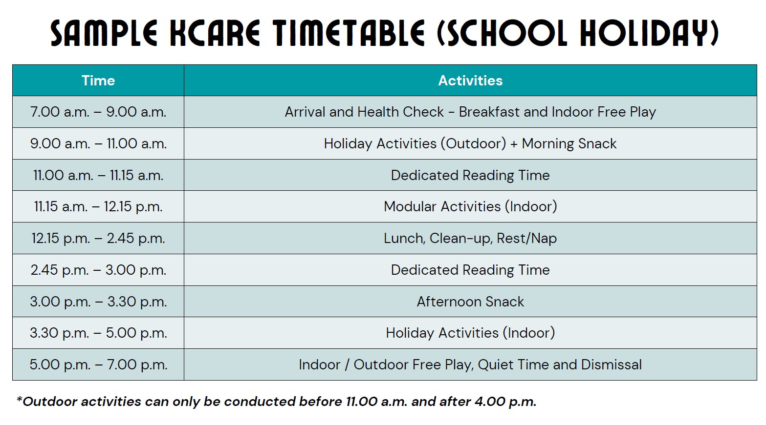During school holidays or when when MK is closed, KCare will continue to operate between 7:00 AM to 7:00 PM.