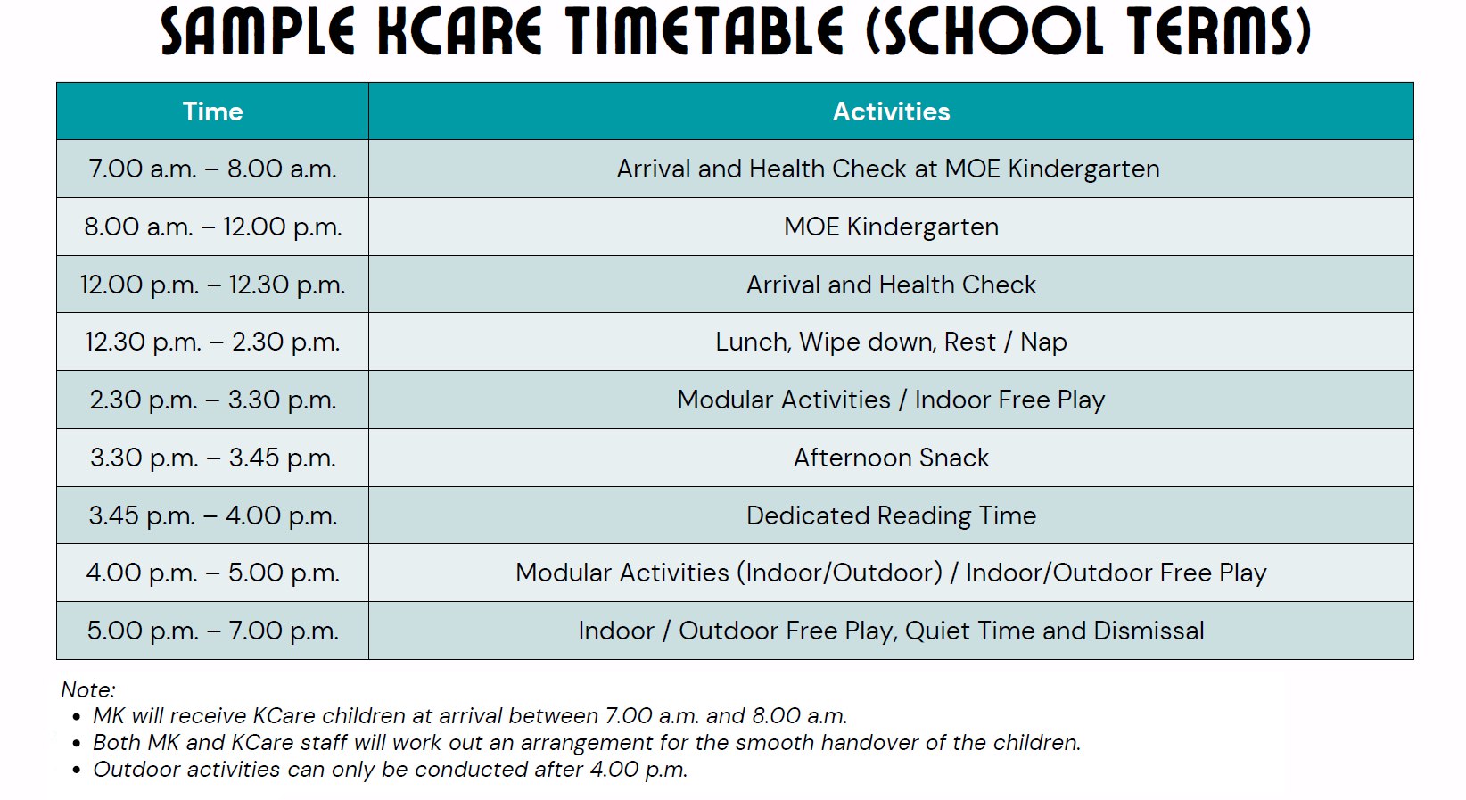 During term time when MK is in operation, MK teachers will receive the children who are in KCare from 7:00 AM and KCare will take over from 12:00 PM to 7:00 PM.